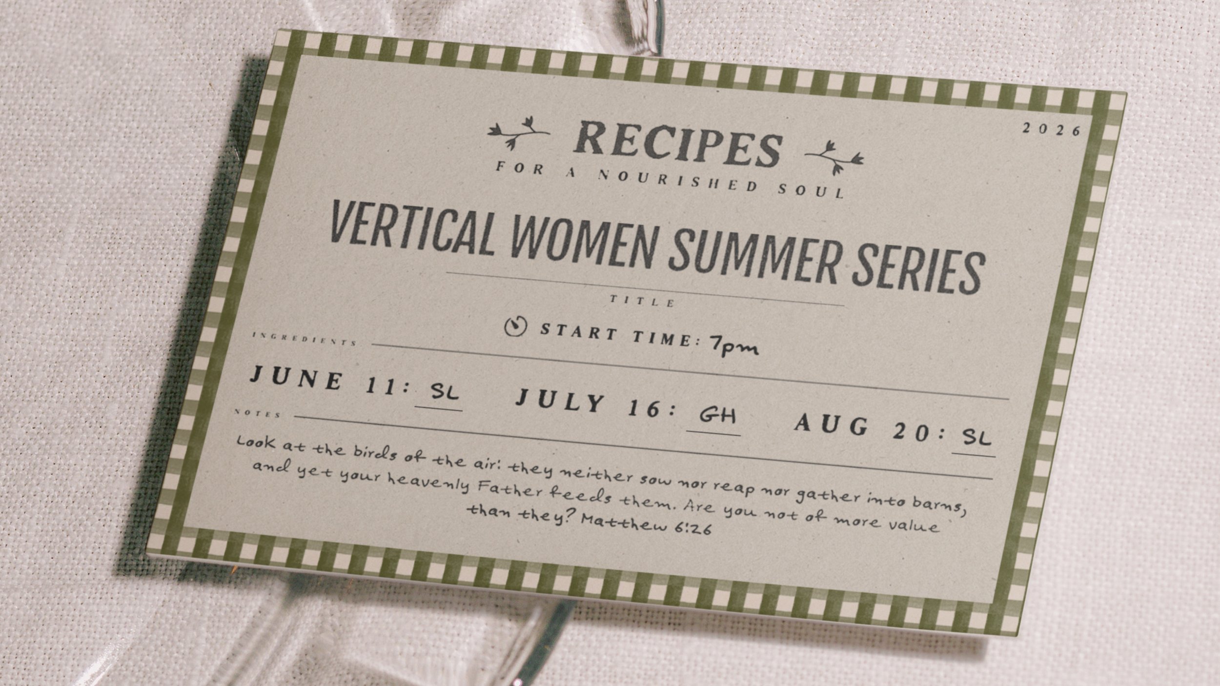 Join us this summer for three impactful night of worship, teaching, testimony, and community. This year we look to God's Word for some important "recipes" for living a vertical life as a follower of Christ. Women ages 16 and older will not want to miss this important time of connection…and some fun and giveaways along the way! Don’t miss this opportunity to grow in faith and draw closer to Him! Mark your calendars for the dates and locations below: